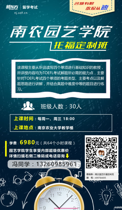 为加快学院的国际化建设进程,提升同学们的英语水平,鼓励更多的同学们“走出去”参与国际交流项目,经商议,必赢bwin官网将于本学期与南京新东方英语培训机构共同开办必赢bwin官网登录入口托福定制班。为方便同学,授课地点为我校教学楼教室,每周2次课程,本院学生将享受低于市场价的优惠价格。有意愿报名的同学可扫描二维码加入QQ群咨询李老师。