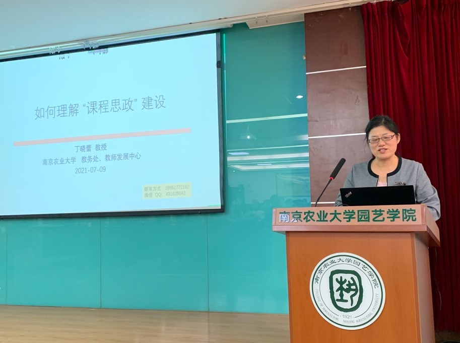 丁晓蕾教授从课程思政是什么、为什么、怎么做,以及课程思政的路径和评价几个纬度,详细地阐述了如何开展好课程思政的方法和思考。她指出,要发挥好每门课程的育人作用,同向同行、形成协同效应,将显性教育和隐形教育相统一。丁教授通过讲述如何挖掘专业课程的思政元素进行教学设计来解答老师们对于课程思政如何融入专业课程的问题,她将要素从六个方面进行汇总,以社会主义核心价值观为首要,结合“四个自信”、中华优秀传统等,并归类为“家国情怀、使命担当、国际视野、人文精神、科学精神、生态文明、学农爱农”等方面。同时,丁教授强调教师要始终以专业讲授为主导,不断摸索课程思政在专业课程中的设计方式,润物无声。