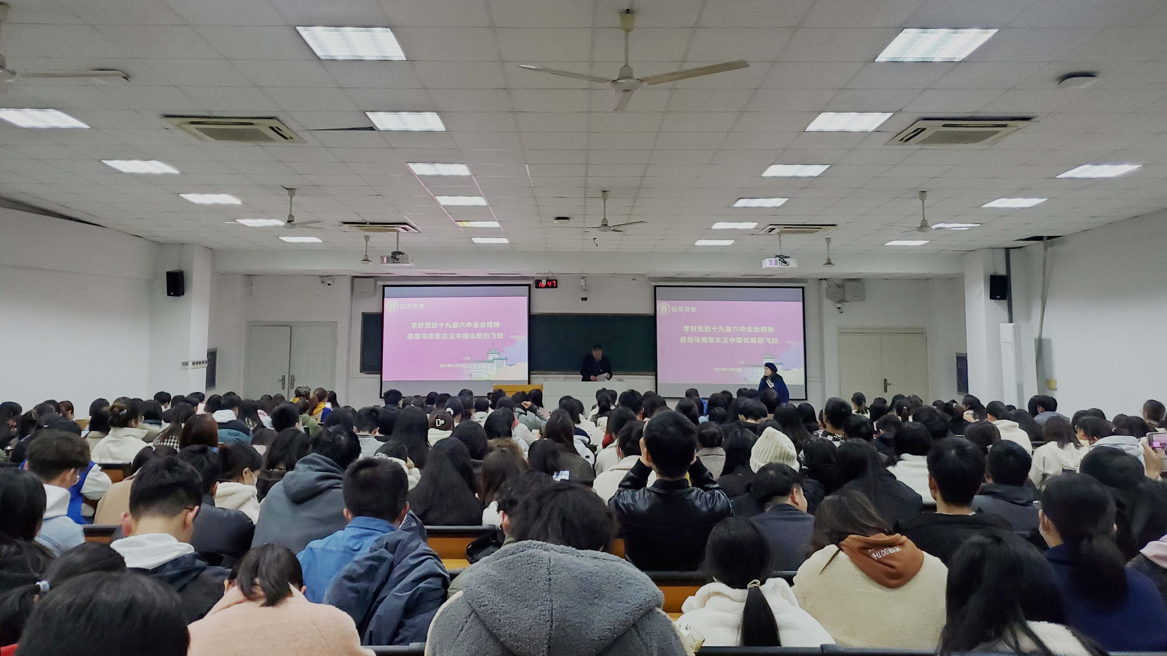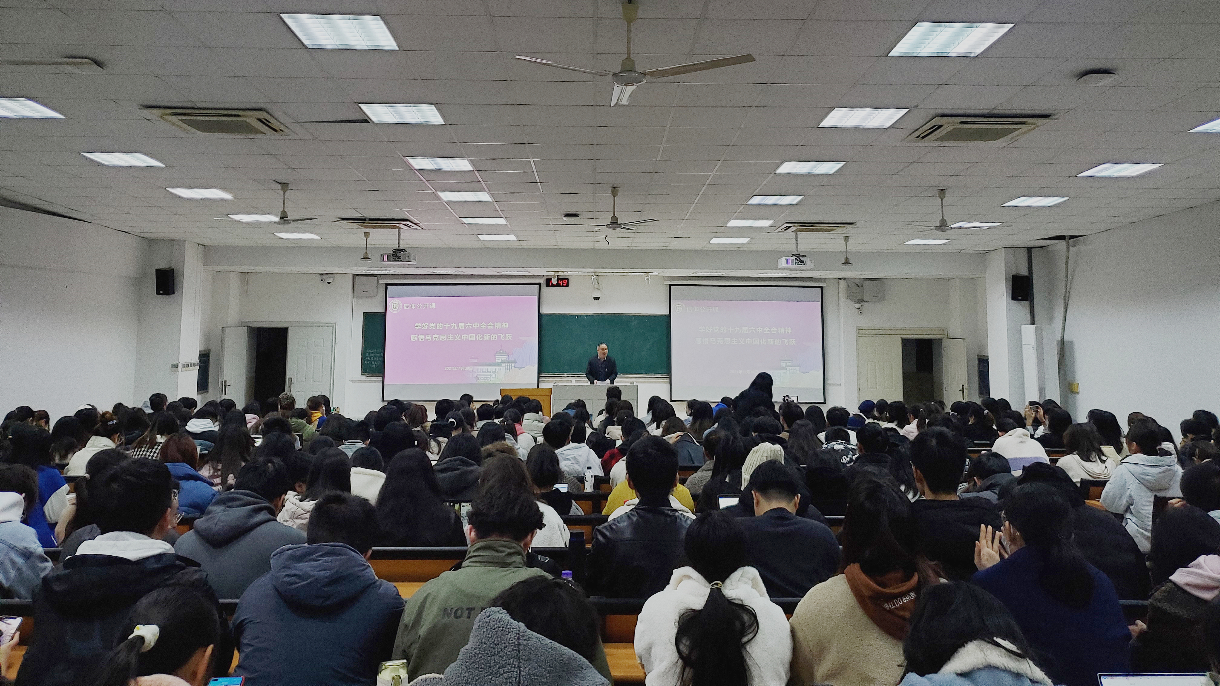 2021年11月30日,必赢bwin官网登录入口在教学楼c301教室举办园思讲堂暨信仰公开课十九届精神专题学习报告会,学习会特邀马克思学院教授吴国清教授担任主讲。本科生辅导员鲁月与300余名本研学生参加了线下学习会,学院其余本研学生均通过网上直播线上观看。学习会由学院学工办主任(团委书记)窦靓主持。