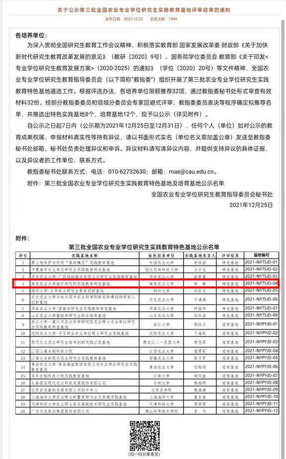 近日,全国农业专业学位研究生教育指导委员会组织开展了第三批农业专业学位研究生实践教育特色基地遴选工作。经教指委委员和领域分委员会专家评审、教指委委员表决等程序,共推选出实践教育特色基地8个,培育基地12个,南农大必赢bwin官网登录入口和南农大宿迁研究院共建的特色实践教育基地成功入选。实践教育特色基地的获批,为我校在研究生实践培养方面提供了更好的载体平台。