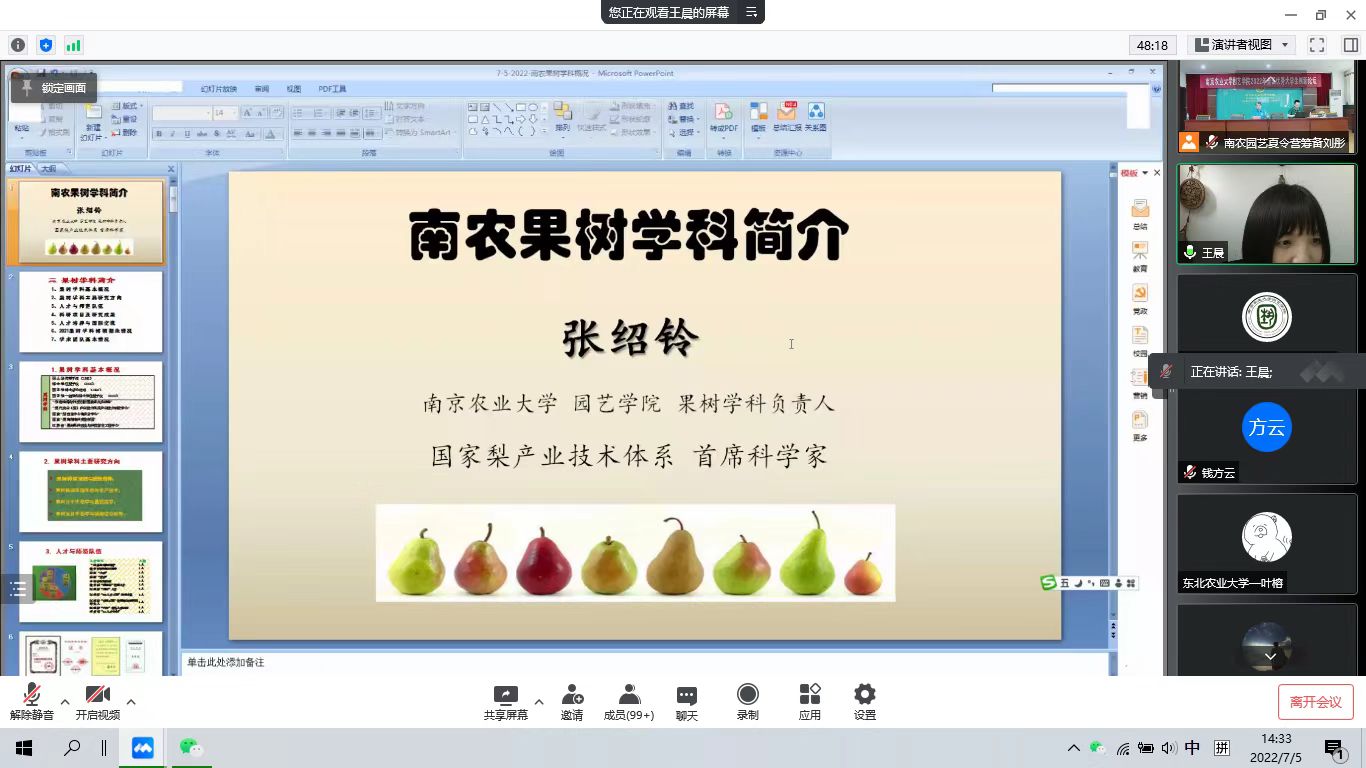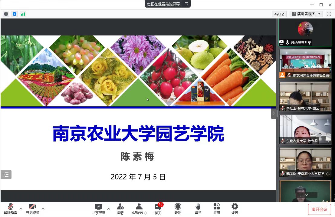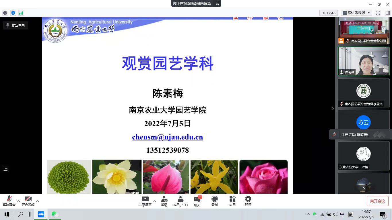 7月5日下午的名家讲坛环节,出席人员有必赢bwin官网登录入口蔬菜学科侯喜林教授、必赢bwin官网登录入口副院长、观赏园艺学科陈素梅教授、果树学科王晨教授、茶学学科房婉萍教授、设施园艺学科孙锦教授、风景园林学科丁绍刚教授。他们分别介绍了学科的师资、各位导师研究内容以及招生就业等情况,帮助学员们对各个学科有了更加深入的了解。