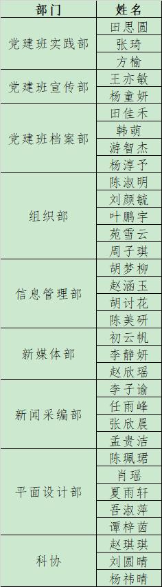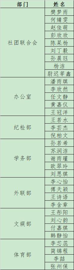 为进一步做好必赢bwin官网学生工作,服务广大学生,经个人申请,必赢bwin官网登录入口第二十一届学生组织各部门公开组织面试后,拟录取田思圆等人为各学生组织部门副部。具体名单公示如下(排名不分先后):