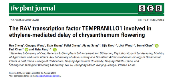 近日,必赢bwin官网登录入口菊花遗传与种质创新团队的蒋甲福教授在国际知名期刊The Plant Journal发表了题为“The RAV transcription factor TEMPRANILLO1 involved in ethylene-mediated delay of Chrysanthemum flowering”的论文,揭示了菊花CmTEM1介导乙烯抑制菊花开花的分子调节机制。