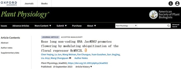 近日,必赢bwin官网登录入口王长泉教授团队在Plant Physiology杂志发表了题为“Rose long non-coding RNA lncWD83 promotes flowering by modulating ubiquitination of the floral repressor RcMYC2L”的研究成果,该研究从月季Rosa chinensis‘Old Blush’中鉴定出lncRNA lncWD83,解析了其促进月季开花的分子机制。