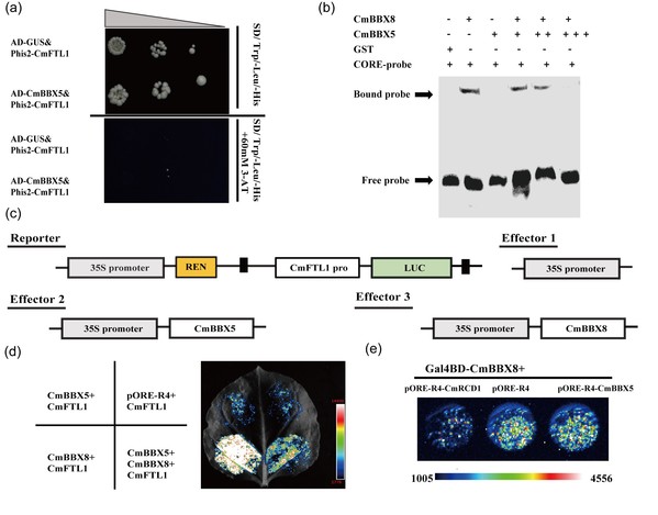 图1 CmBBX5抑制CmBBX8与CmFTL1启动子之间的相互作用以及对CmBBX8转录活性影响