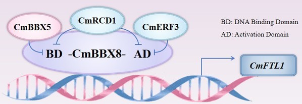 菊花多为短日照品种,于秋季开放。夏菊属于光周期不敏感类型,在长短日照下均可开花,但目前品种较少,开花机理也不清楚。团队前期发现CmFTL1是夏菊“优香”在长日照条件下的开花素,且被B-box蛋白CmBBX8直接转录调控,说明该BBX8-FT模块在夏菊开花调控中发挥重要作用(Plant Biotechnology Journal 2020);CmBBX8同一亚家族成员CmBBX7在调控夏菊开花中也发挥了重要作用,和CmBBX8协同促进CmFTL1的表达,在加速开花过程中起着“涡轮增压”的作用(Molecular Horticulture 2023)。