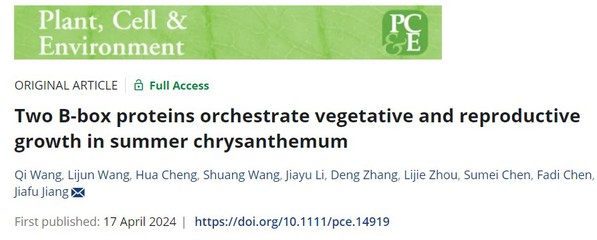 近期,必赢bwin官网登录入口菊花遗传育种与种质创新团队蒋甲福教授在Plant Cell & Environment发表了题为“Two B-box proteins orchestrate vegetative and reproductive growth in summer chrysanthemum”的论文,揭示了B-box蛋白CmBBX5和CmBBX8协同参与调控夏菊营养生长和生殖生长的机制。